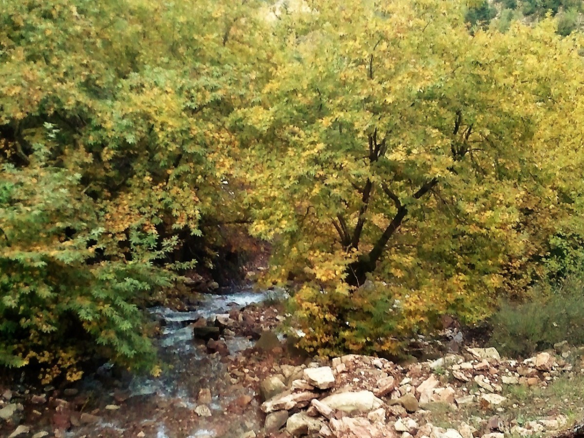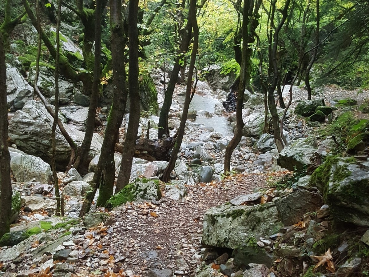 Το κατέβασμα προμηνύει λίγη προσπάθεια στην επιστροφή. Μανιτάρια ξεπροβάλουν στις ρίζες των δένδρων, ενώ ένα γάβγισμα ακούγεται από τα πέρα χωριά. Κάνει παρέα στον ήχο του νερού που όσο κατηφορίζουμε δυναμώνει. Και καθώς σκεφτόμαστε πόση ανηφοριά μας περιμένει, φτάνουμε στην άκρη, εκεί που σε μπαλκόνι το μονοπάτι γίνεται και εμείς αποσβολωμένα μαγευόμαστε από την ομορφιά του τοπίου. Νερά τρέχουν από παντού. Στάζουν από τις πρασινάδες που χύνονται στα βράχια, κυλούν στο ρηχό ποτάμι, βρέχουν και βρέχονται από στάλες και άλλες στάλες, υγραίνοντας τα πάντα. Θαρρείς πως μάγισσα θα βγει από την ομίχλη της βροχής και θα ζητήσει το λόγο που πατήσαμε τα μέρη της... Αν είχε ζέστα, μια περπατάδα στη βροχή των νερών θα άξιζε σίγουρα τον κόπο, όμως δεν κάμουμε δεύτερες σκέψεις... Αιχμαλωτίζουμε τη μαγεία των στιγμών στο μυαλό και στα κινητά και με βαριά καρδιά που θα αφήκουμε πίσω τέτοια ομορφάδα, ανηφορίζουμε προς το χωριό για το αμάξι...