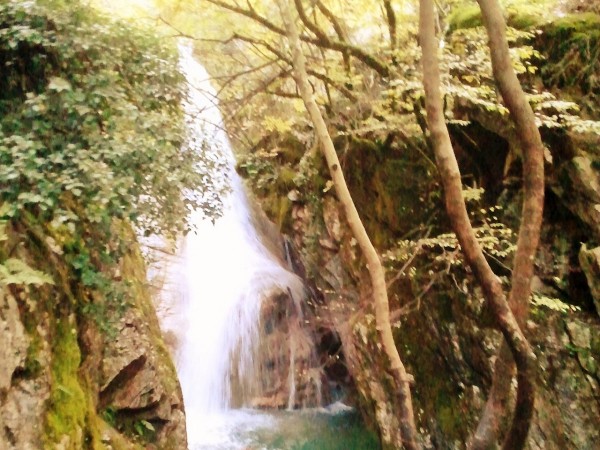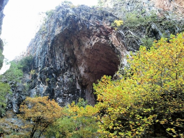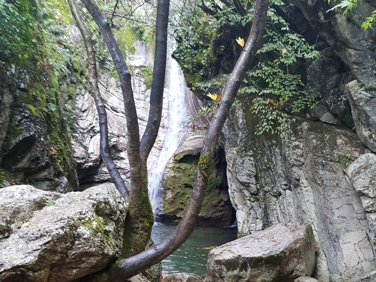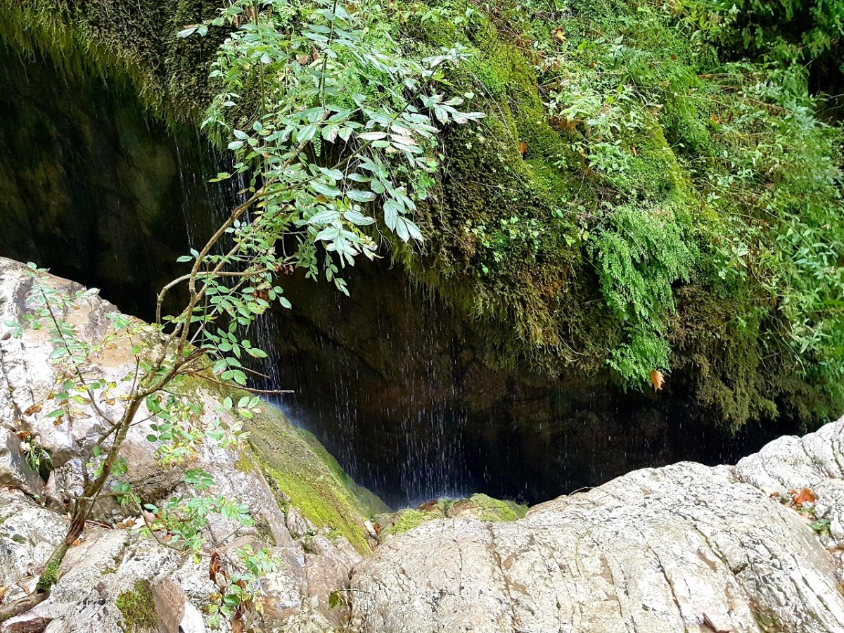 Καλό ακούγεται, για να χωνέψουμε όσο φάγαμε και ήπιαμε. Η διαδρομή από αρχής χαρίζει απλόχερα την ομορφάδα της… Το μονοπάτι κυλά ελαφρά ανηφορικό μέχρι την ξύλινη γέφυρα που αγναντεύει τον φασαριόζικο καταρράκτη της. Λες και περπατάς σε παραμύθι. Πλατάνια περιτριγυρίζουν το ποτάμι, τα νερά ξεπλένουν κάθε σου έγνοια και συ τράβας μια σέλφι για να πιστεύεις αύριο, το παραμύθι που περπάτησες... Ανηφορίζουμε το μονοπάτι δίπλα στο ποτάμι, που κυλάει ορμητικά πλάι μας. Και άλλοι καταρράκτες, θαρρείς πως θέλει ο καθένας να εντυπωσιάσει πιότερο από τους άλλους τις αισθήσεις σου. Και εκεί στης ανηφοριάς τα βήματα, που λόγω της πέτρας και της υγρασίας γλιστρούν στα πατήματα σου, ανασηκώνεις το βλέμμα και την αντικρύζεις. Μια σπηλιά, μια μαύρη σπηλιά φοβιστικά σε θωρεί από ψηλά, μετρώντας τη θέληση και την προσοχή σου να την κατακτήσεις. Η αλήθεια είναι πως ακόμα και τα ορειβατικά πατινάρουν στην γλιστράδα του ξύλου και της πέτρας στο διάβα τους. Αν έβρεχε θα ήταν πολύ επικίνδυνα τα πράγματα. Μα η σαγηνεύτρα μας καλούσε και μόνη βροχή αυτή του νερού στα βράχια. Κρατήθηκα, μετρίασα τη φοβία της γυναίκας και ανέβηκα. Μια στάση στα ψηλά, δυο φωτογραφίες από τα κάτω και με προσοχή προς τα πίσω. Τα κινητά αποθανατίζουν την ομορφάδα της φύσης. Άξιζε σίγουρα η ανάβαση...
