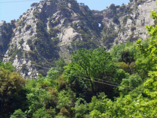 Σήμερα έχουμε κάμποσο περπάτημα να κάμουμε... Κινούμαστε με το αυτοκίνητο προς Προυσσό. Η διαδρομή είναι ιδιαίτερα γραφική πλάι στο ποτάμι. Καθώς ο ποταμός βαδίζει προς διπόταμο για να σμίξει τα νερά του εκεί, πριν να ξεχυθεί στο κατάντι, βράχια κάθετα σου κόβουν την ανάσα. Στην άκρη εκεί που τα βράχια σκεπάζουν το πέρασμα, ένα εκκλησάκι και δίπλα του μια σκάλα και γαντζωμένα στο βράχο λογής λογής αφιερώσεις. Κάμουμε μια στάση…Από εδώ πατώντας στον κατακόρυφο βράχο, λέγεται από τους παλιούς, πως πέρασε η Παναγιά στο δρόμο προς τον Προυσσό. Σκαρφαλώνουμε τη σκάλα και κοιτάμε τα πατήματα. Άξια της προσοχής κάθε διαβάτη. Κάνουμε το σταυρό μας στην μικρή κλησιά και προχωρούμε. Λίγο πιο κάτω αγναντεύουμε πάνω από το ποτάμι, την τρύπα που άφηκε η Παναγιά περνώντας το βουνό…