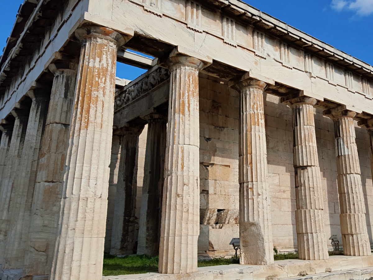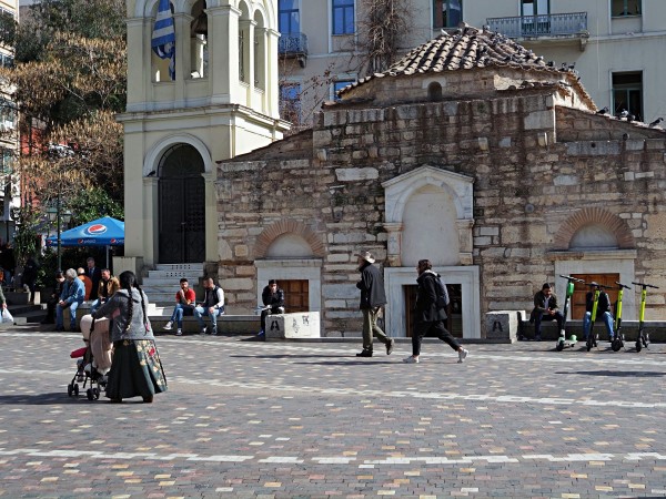 Πάμε προς Μοναστηράκι όπου τα στενά πλημμυρίζουν με κειμήλια από όποτε, που στέκουν εκεί προσδοκώντας να τραβήξουν την προσοχή και τον παρά σου... Δίπλα στο παλιό τζαμί, κόσμος και περιστέρια γίνονται ένα, ενώ μουσικοί της πλατείας δίνουν και δω παράσταση για τα πλήθη... Στη γωνιά καθόμαστε για ένα σουβλάκι από τα παλιά και σαν τελεύει το πιτόγυρο, πάμε στα στενά προς Θησείο. Αγναντεύουμε αντίκρυ από τις γραμμές, την παλιά αγορά. Δω μέσα μεις χωθήκαμε πριν καιρό και απολαύσαμε το επιβλητικό κτίριο, καθώς και τον καλοδιατηρημένο ναό του Ηφαίστου, που για χρόνια, μεις οι παλιότεροι, θωρούσαμε στα σχολικά εξώφυλλα των βιβλίων της ιστορίας μας.