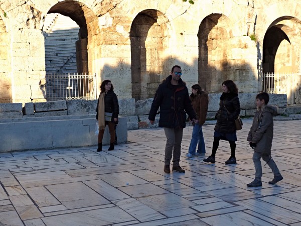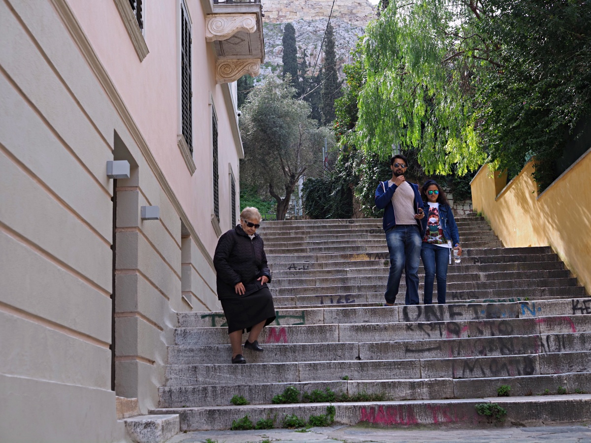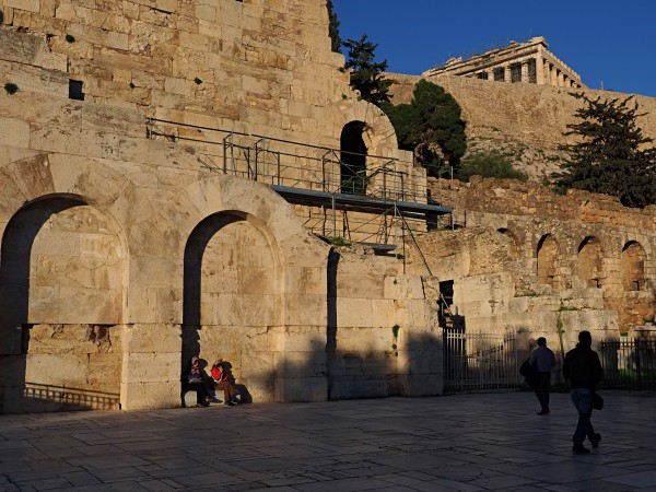 Ανάμεσα στο νέο μουσείο και στο βράχο, παίρνουμε τη Διονυσίου Αρεοπαγίτου όπου κάθε γωνιά και μια ζωντανή παράσταση δρόμου... Στο ύψος του Ηρώδειου κόσμος πολύς! Ρίχνουμε κλεφτές ματιές από τα πλάγια, στα μέσα του θεάτρου κι αναπωλούμε τις βραδιές που σα θεατές του ονείρου, αφεθήκαμε και μεις στην μουσική απόλαυση των τραγουδιών στο αρχαίο τούτο θέατρο...