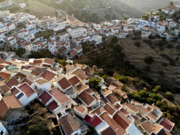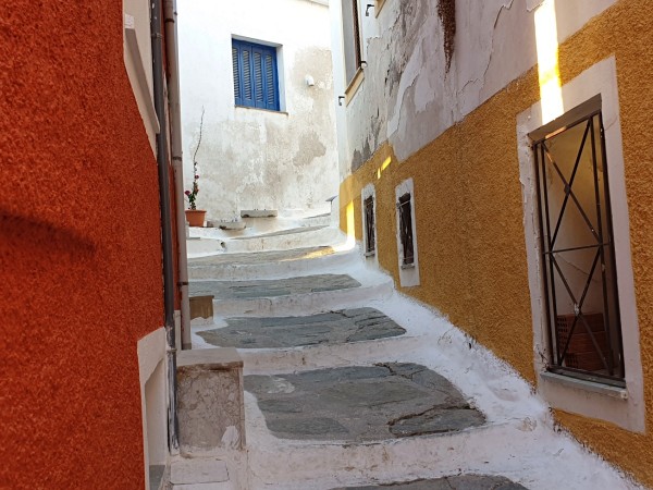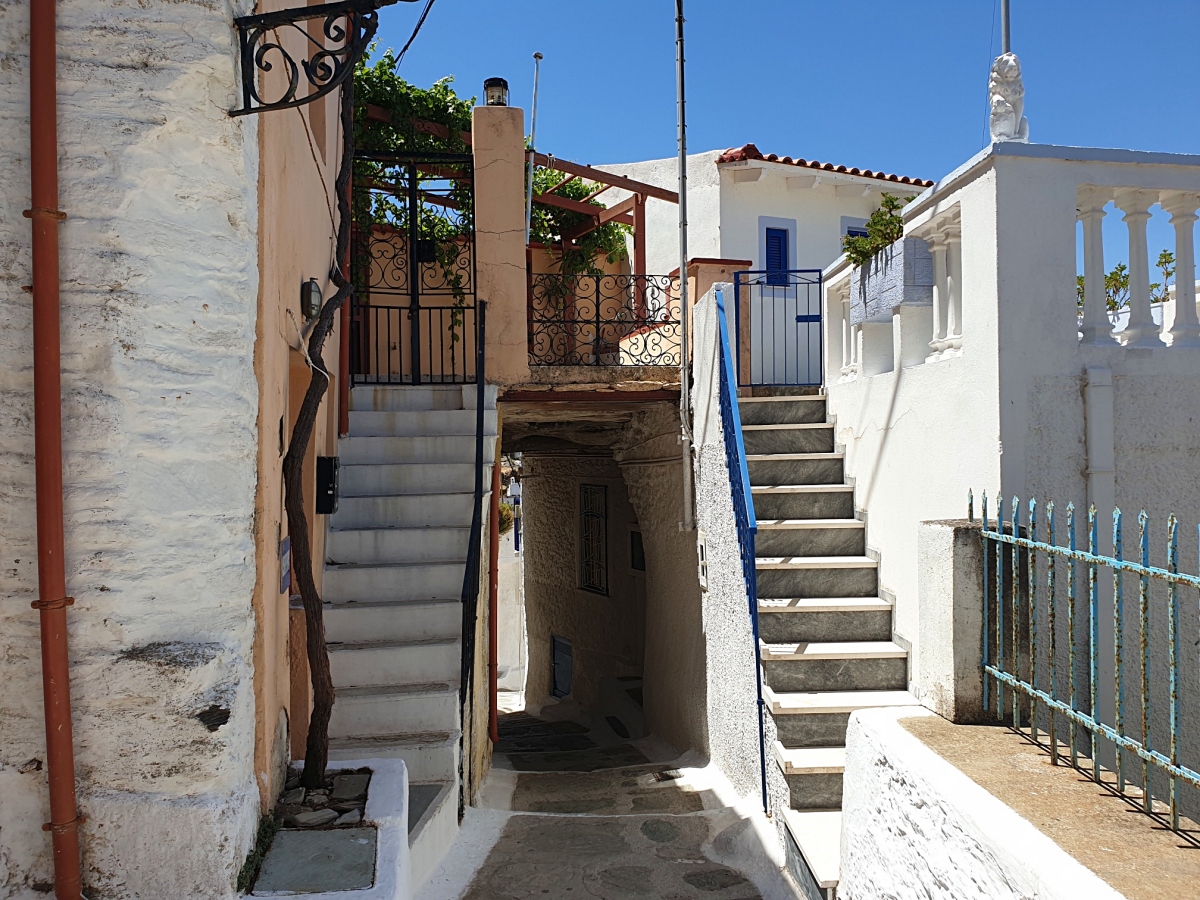 Στην Ιουλίδα, την Χώρα του νησιού, οι αυλές των σπιτιών εκτείνονται χαρακτηριστικά πάνω από τα καλντερίμια, διαμορφώνοντας τα λεγόμενα στεγάδια.
